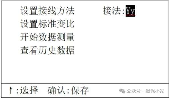 2. 打開全自動(dòng)變比測(cè)試儀的電源開關(guān),在主菜單上設(shè)置好接線方法和設(shè)置好標(biāo)準(zhǔn)變比